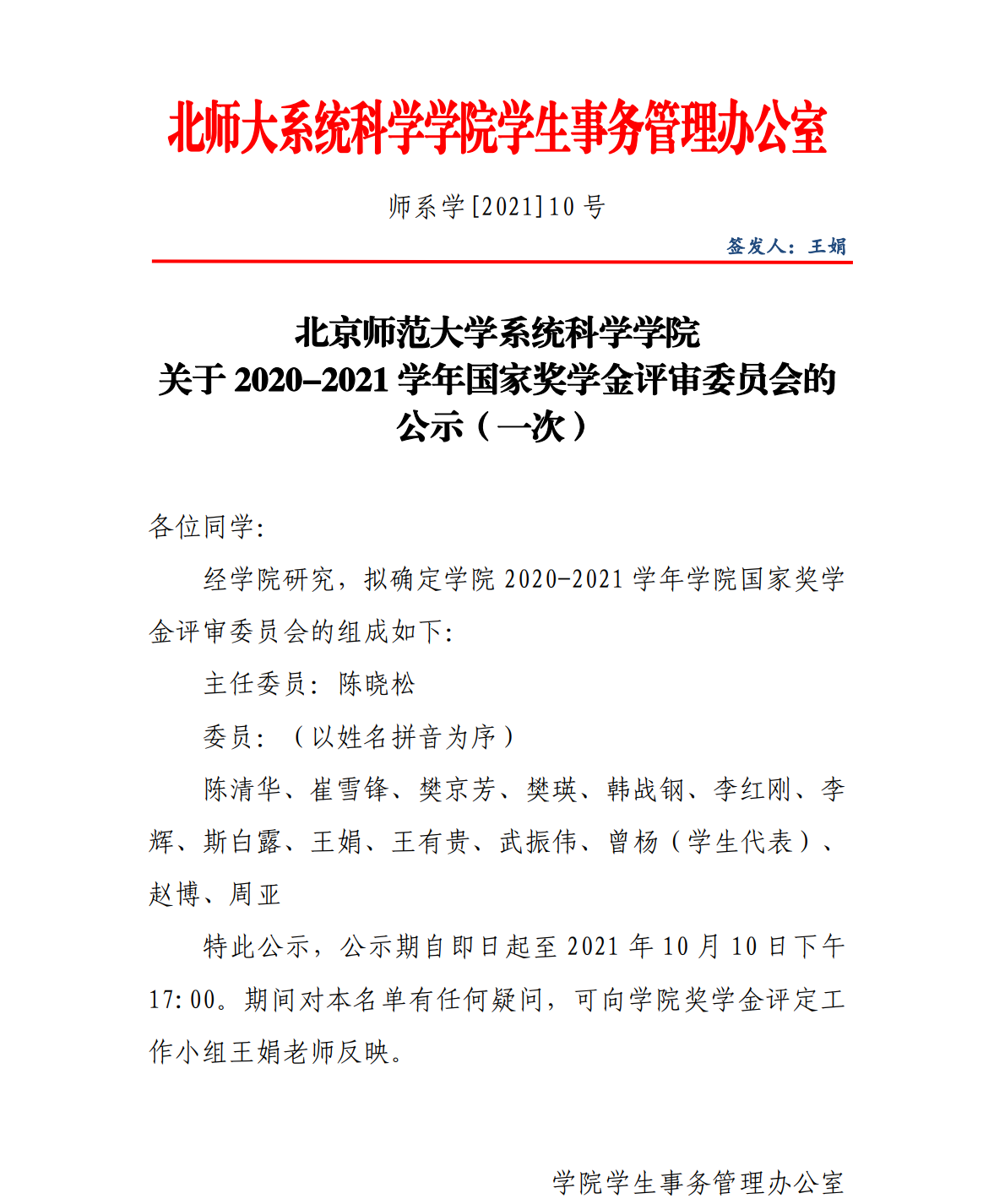 关于2020-2021学年国家奖学金评审委员会的公示(一次)