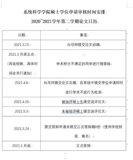 解答:学校研究生网站已公开毕业论文格式要求,详见官网说明。毕业论文字数无具体要求,详情需咨询导师。按往年要求,毕业论文查重率小于5%。毕业时学位论文审核时间安排详见如下表格。